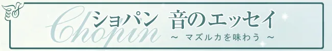 ではこの作品を演奏するとき、皆さんはどの小節を持って終わりとすれば良いと思いますか? A.ルービンシュタインは、2回繰り返した後に前奏の4小節をつけて終わらせており、永遠に続く音楽が余韻を残し消えてゆくような録音となっています。私も悩みまして・・・ショパンには大変大変申し訳なく思いますが、今回はハ長調のI度で気分が高揚して終わるように、終止の場所を含め少々アレンジさせていただきました。「生の飛躍(エラン・ヴィタル)」が表現できているでしょうか・・・? この作品の演奏方法に関しては様々な意見があると思いますし、時間が経てば私の考えも変わる可能性があります。これからも違うパターンを試奏してみたいと思います。 ショパン音のエッセイ~マズルカを味わうTOP