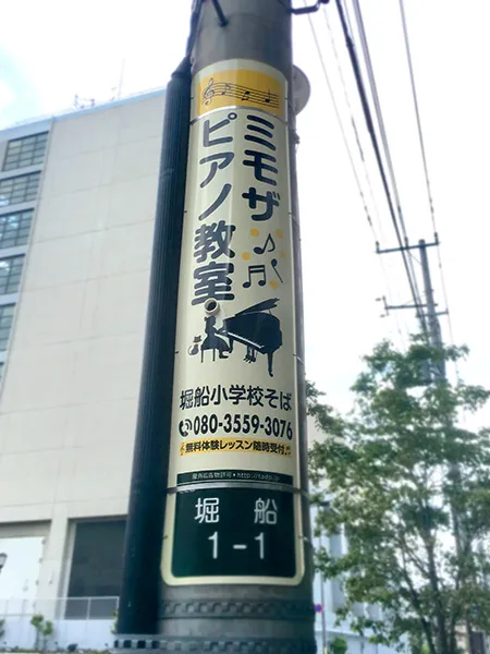 現在はあわせて電柱看板も掲出しています。教室から徒歩圏内、小学校の前と幼稚園の前の計2か所、もちろん場所にもよるとは思いますが費用が意外と安価で、そしてみなさん結構目にしてくれます。