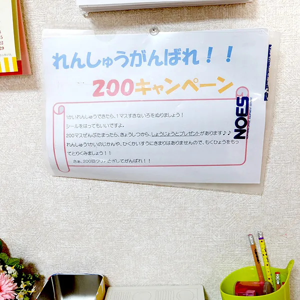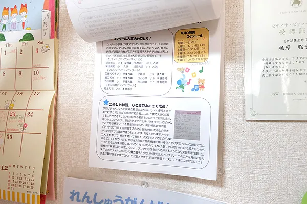 レッスン室の壁には、先生がまとめたコンクール情報や、発表会までの日めくりカレンダー、れんしゅうキャンペーンなど、生徒さんの興味を惹く工夫がたくさん!