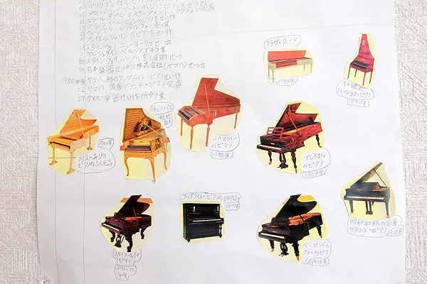 コンペで入賞した生徒さんは、自由研究でピアノの歴史についてまとめた。他の生徒さんにとっても勉強になる内容なので、レッスン室に飾っている。