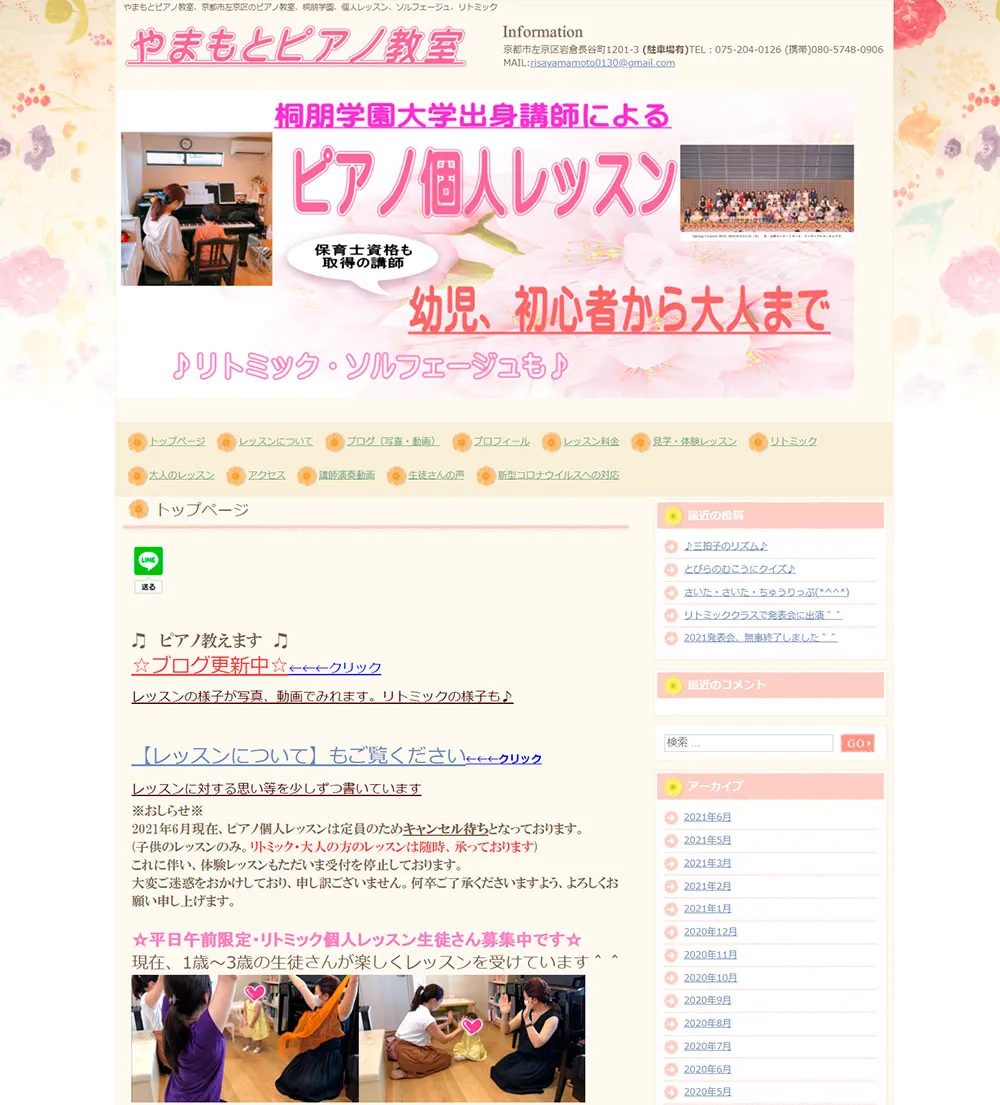ウェブページの作成も動画の投稿も苦手な方なのですが、地盤のない自分がやっていくには「自分がどんな人間か」「どんな雰囲気の教室か」をわかりやすく伝えないとダメ…!という一念で頑張りました。それから、ピティナの教室紹介や外部の仲介サービスも利用しました。 やっぱりインターネットの力は大きいですよね…今もホームページを見て来られる方が多いです。
