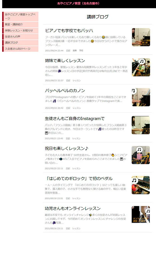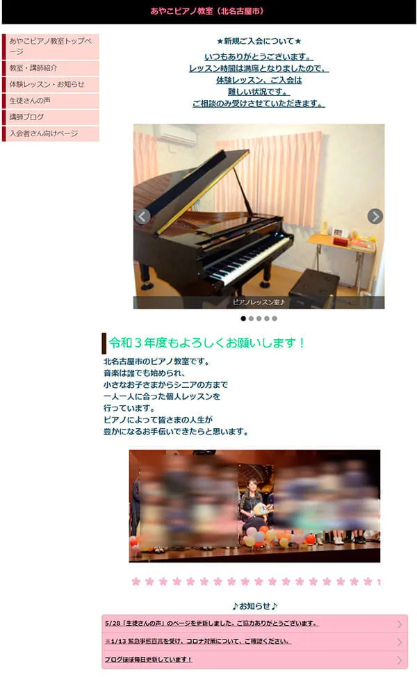 今いる生徒の多くがホームページを見て問い合わせをしてくれました。ホームページは自作で、クレヨンというサービスを使用しています。教室独自のドメインを設定するために、有料プランを利用していますが、年間10,000円かかりません。レイアウトなどすべて自分で行いました。そんなホームページですが、作っただけでは、検索に上がらないということすら知らないスタートでした。SEO対策の本を読み、ワードに気を付けることを知ったところで検索順位を上げるのは難しいものでした。さまざまな対策の積み重ねで、上位に上がってきたと思いますが、ホームページ内のブログを教室の生徒や教員時代の教え子、そのご家族が読んでくれて、閲覧数が増えたことが功を奏したのかもしれません。今では自分の考えをお伝えするコミュニケーションツールにもなっていると思います。出身地でもなく、ピアノ講師歴もない私にとって広報活動のため、必要に迫られて始めたホームページですが、現在は在籍生徒や興味をもって読んでくださる方を思って、楽しみながら日々ブログを書いています。