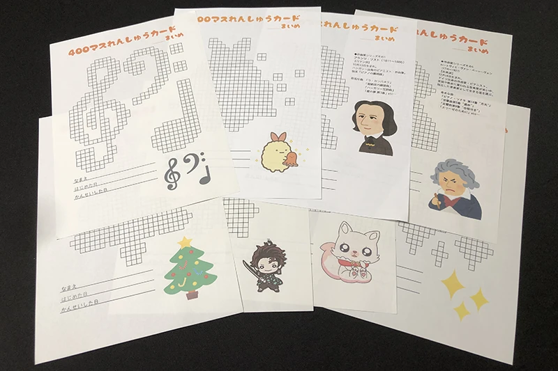 私は、デジタルイラストの創作が好きで、学生時代からWebサイトも作成していました。この時の経験は、教室の広報やレッスングッズの作成に活きています。例えば、バスティンの教本から着想を得た400マス練習帳には、愛着をもって使ってもらえるよう生徒に流行のキャラクターのイラストを描きました。