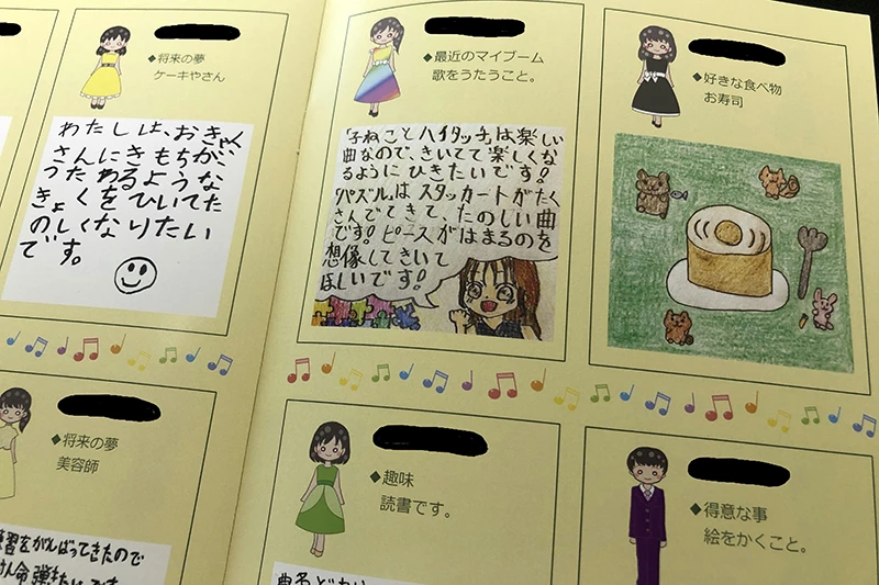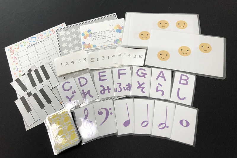 発表会に向けては、7段階の「上達度チェック表」を作成。自分の「現在地」を可視化し、練習のモチベーションを引き出せるよう工夫しています。また発表会当日は、自作の「メッセージカード」を使って、お互いの演奏を聴きあい感想を交換しています。今では生徒だけでなく、保護者の方も書いてくれるようになり、90枚近くのカードが行き来しています。 また最近ではソルフェージュの面から生徒の課題を見つけて補強できるよう、指番号を瞬時に弾くタイムアタックや音当てクイズ、視唱などのテストカードを作成しました。ピアノ指導者こそが、生徒の成長のために自分の得意を活かせる「天職」だったのかもしれません。