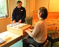 この楽器に現在なお挑戦している製作家が、世界に二人います。その内の1人が、私の友人小渕晶男さんです。今回は彼の楽器の音をご紹介しましょう。これは、彼の4号器で、弓を回転させるためには、もう1人の人が、手でハンドルを回す仕掛けになっています。