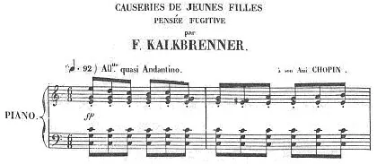 カルクブレンナーにはショパンに献呈した作品もある。19世紀、ピアニストたちは、自作を出版する際、表紙に献辞を掲げて互いに敬意を表し合ったが、時には誤解もあったであろう。彼の《若い娘のお喋り?はかない思いCauserie de jeunnes filles―Pensée fugitive》(譜例3、曲冒頭)は、わずか4ページのサロン・ピースで、タールベルクに献呈されたソナタとは対照的に、ショパンのヴィルトゥオジティが反映されていない。このタイトルからしても、カルクブレンナーは、ショパンをもっぱらサロン音楽家とみなしていたのかもしれない。