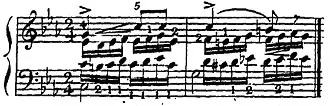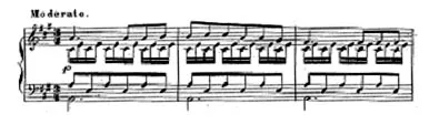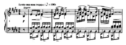 この例として、彼は自身の初期の《24の練習曲 作品20》の練習曲から第2番の一節を引いている。いかにその例を引用する(譜例1)。