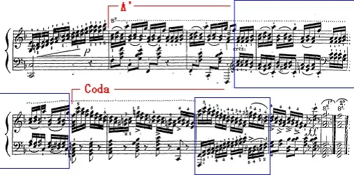 主題に回帰するA'には、A(譜例12)の前半と比べて左手に大きな跳躍が加わっており、また後半(青でマークした部分)では両手が対称的な動きで三度音型を演奏するように変化が加えられている。この対称的な動きは更に、コーダの終わりに見られる。 譜例15 第13小節~第21小節A'とコーダ。
