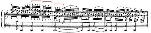 例えば譜例の赤でマークした部分では、5の指を連続的に用いるよう指示されている。上声部の5-5-5-4という運指は、機能上の都合ばかりでなく、異なる鍵盤を同じ指で演奏することによって、スタッカートの効果を際立たせる意味も持っている。そして、スラーの部分は5-4の滑らかな運指となる。このように、指使いとニュアンスに矛盾が生じないような配慮も入念に行われている。