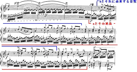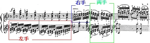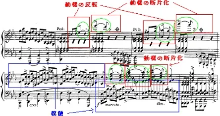 このような動機労作をしながら、ここでも両手で交互に同じ音型を担う模倣が見出される(青で囲った部分)。