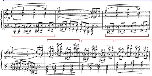 左手の三連符→四分音符という急速な跳躍は、途中で順序を変え、四分音符→三連符という形になる。上の赤でマークした三連符の下行形は、曲冒頭でオクターヴを成しながらなだれ落ちる音型(譜例16)から来ている。この音型は、上の譜例19の最後の小節に再び現れるが、これは先の赤のマークされた三連符によって導かれている。こうした前出の動機を利用して全体を統一しようとする傾向は、これまで見てきたとおり、この練習曲を通して観察される。