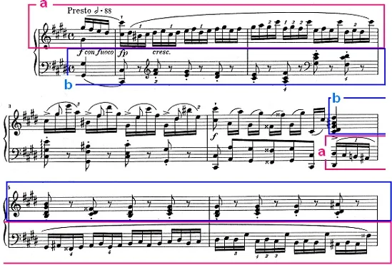 最初の主要動機(次の譜例の四角で囲った部分)は、このすぐ後に現れ、これが一小節おきに両手に配分される。