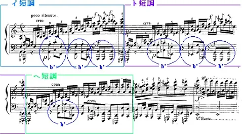 この後には、第10番の二つの「難所」が待ち構えている(譜例5)。一つ目は、左手でオクターヴを形成しながら現れる b'(以下の譜例の青丸で囲った部分)と、右手の分散和音である。これはイ短調、ト短調、ヘ短調で三度繰り返される。