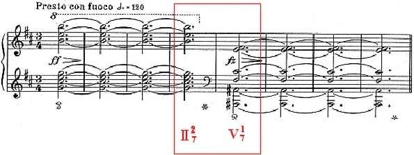 譜例9 ショパン:《スケルツォ》作品20 冒頭 II度の第二展開形に続き、属七の第一展開形がくる。