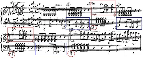 この旋律の下では、左手がオクターヴの音型を担う。テクニックの観点から見れば、この音型がB部前半の主要音型である(赤でマークした部分)。これは、次に右手に移る。これもやはり両手が等しく同じ音型を担わせるための配慮であるが、右手のオクターヴには大きな跳躍が見られる。しかし、この不均衡は、次の部分で補われる。 B部冒頭の旋律は、もう一度、異なるオクターヴの音型を伴って現れる(譜例24、青でマークされた部分)。ここでは、先ほど跳躍の機会を逸した左手のオクターヴが、比較的長く、大きな跳躍をともなって展開される(赤でマークされた部分)。 譜例24 第49小節~第57小節。今度は左手の動きに重点が置かれる。