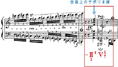 譜例8 B部の終わりを示す和音。主音上のナポリII度に続き属七の第一展開形がくる。