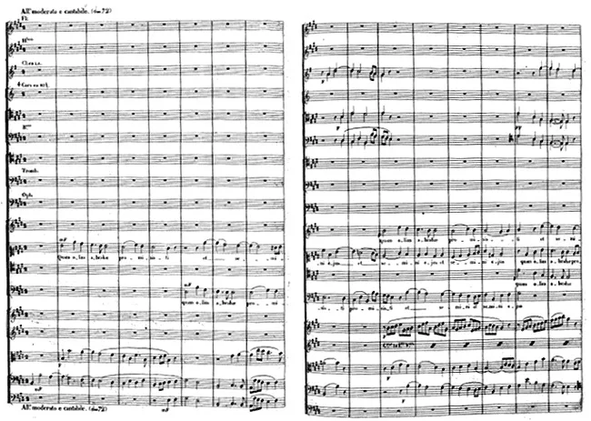 言葉[典礼のテクスト]の精神を忠実に翻訳する必要性は、パレストリーナ風の手法や、モーツァルト、ヘンデルのフーガ様式だけで満足することをゆるさない。その必要性は、世俗の芸術の介入、すなわち情熱的な旋律や、世俗的な和声の激しい効果、オーケストラの色彩豊かな楽器の組み合わせの使用を喚起し、要求する。昔の様式の厳正な言語の中で、この散文を完全に、人間的で肉体的な情熱で全く生き生きしたものにすることは不可能だということは、今や明白である。大家たちもまた、テクストの抒情的な解釈が要求に応じて世俗芸術から、あらゆる借用を行うことを決してためらわなかった。※5