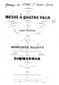 オペラが思うように成功しなかったためか、しばらく彼は40年代の終わりまでピアノ以外のジャンルから遠ざかる。再び作曲への意欲に火がついたのは1840年代半ばのことだった。その時彼が目を向けたのは、オペラではなく宗教曲というジャンルだった。これは「作曲家」のステイタスを獲得するための二度目の挑戦となった。最初に彼が手がけた宗教曲は《荘厳ミサ曲》である。オーケストラとソプラノ、アルト、テノール、バスのために書かれたこの作品は、ベルリオーズのレクィエムなどが初演されたサン=ウスタシュSaint-Eustache教会で1845年11月22日に初演された。ヅィメルマンは知人や生徒に多くの招待状を送っていたので、教会には多くの人々が集まった。右図は《荘厳ミサ曲》の表紙である。作品は音楽院作曲科教授アレヴィに献呈されているが、米国議会図書館所蔵の楽譜には、表紙上方におそらくヅィメルマンの自筆で「スポンティーニへのオマージュ」と記されている。彼がスポンティーニに個人的に献本したのだろうか。