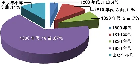 次に、ヅィメルマンがいつごろ出版された練習曲に多く言及しているのか見てみよう。以下のグラフは、出版年代別に見た参照曲数の割合を示したものである。数値は、年代、作品数、割合 (パーセント) の順に表示されている。作品数は一つの作品番号を一と数えている (各練習曲を一曲ずつ数えた値ではない)。 図3.4 出版年代別に見た『百科事典』における参照曲数の割合