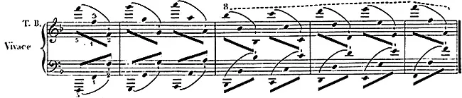 [^1]: ヅィメルマンが他の箇所で参照しているラヴィーナの《12の演奏会用練習曲》 作品1の第5番も、ヅィメルマンの示す音型と類似している。以下にその最後の数小節を示す。テンポはアレグレット・コン・グラツィア、♩=144であり、タールベルク以上に急速である。
