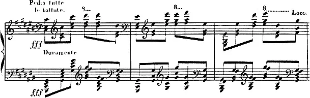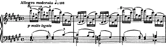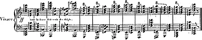 ここでは、左 (楽譜中ではGと表示)‐右 (楽譜中ではDと表示) ─ 左 ─ 右の順で手が頻繁に交差を繰り返す。この動作によって、僅か1拍の間に3オクターヴ以上に及ぶ和音と旋律の同時的な演奏が可能となっている。