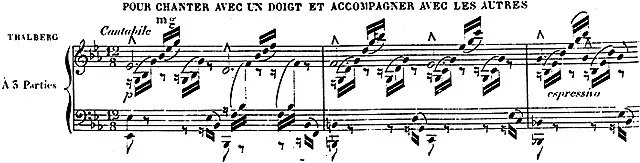 この技法は、ピアノの中声部に旋律を配置し、その周囲を分散和音で伴奏付けするためのテクニックである。ヅィメルマンは、参照を勧めているタールベルクの第3番をそのまま実例として挙げている。