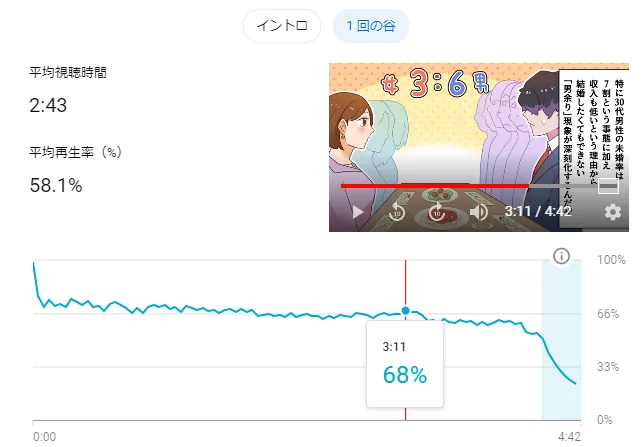 この動画の視聴者維持率をアナリティクスで確認してみるとこんな結果になりました。