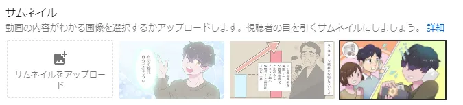 もっとも簡単な設定方法が、システム的に抽出された3つの画像から選択する方法ですが、この場合いまいち何の動画なのかが分かりづらく視聴者にとって再生したくなるものにならないケースが多いです。