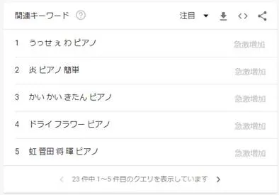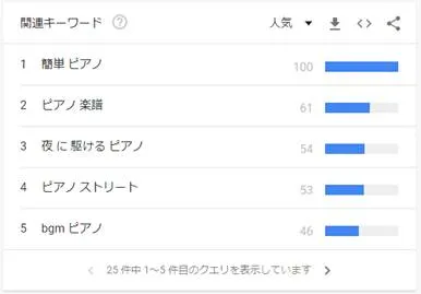 となり、YouTubeでは圧倒的にピアノが検索されていて、かつ右肩で成長していることがわかったりします。さらに「ピアノ」関連の検索の仕方としてどういうものが多いかというと…