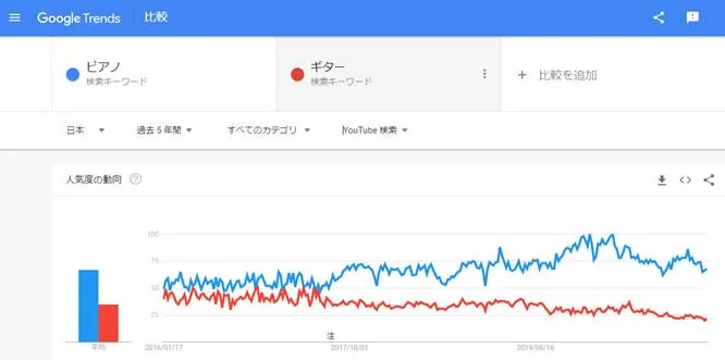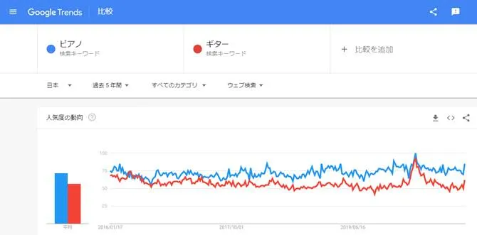 例えば「ピアノ」と「ギター」というワードの過去5年間の「WEB検索」における推移を見てみると…