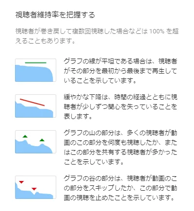 以下は動画単位のYouTubeアナリティクス>エンゲージメント>視聴維持率で確認できるグラフガイドになります。