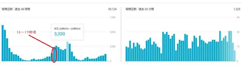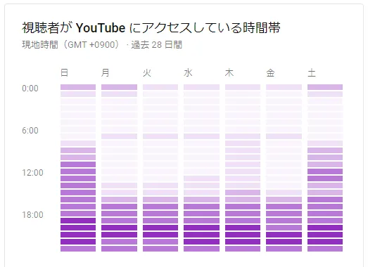 平日なら20時以降が視聴のピークであることがうかがえます。この時間帯を狙って予約公開(YouTubeでは公開時間をあらかじめ予約設定しておくことが可能)するチャンネルも多いと聞きます。
