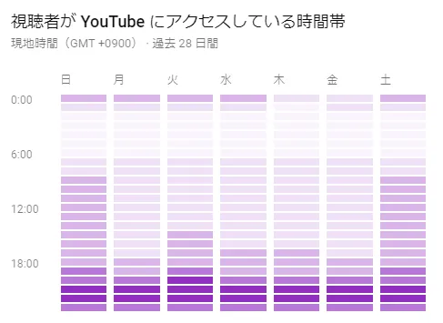 「視聴者」下部にはさらにそのあたりを深堀りできる仕組があります。例えば、このチャンネルの視聴者の多くがYouTubeにアクセスしている時間帯を見ることができます。