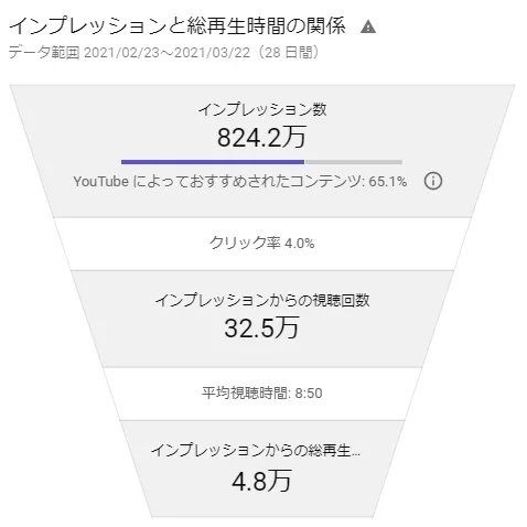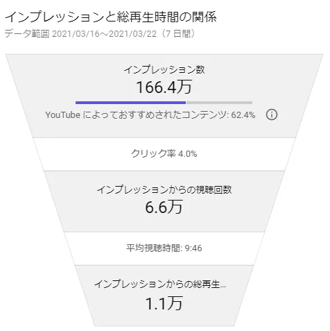 どれくらいYouTubeの中で露出され、どれくらい視聴に繋がり(クリック)、結果としてどれくらいの頭数で、どれくらい視聴されたのか、ということになります。