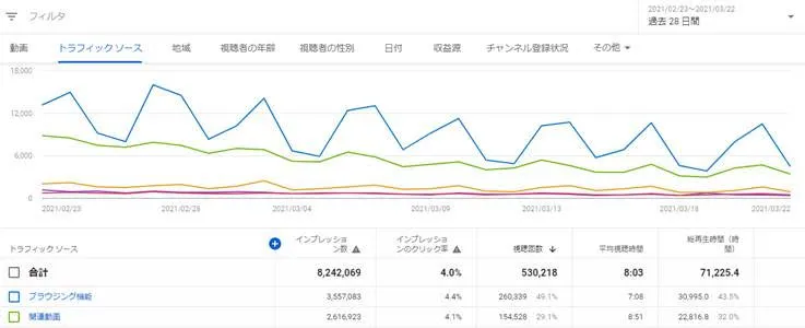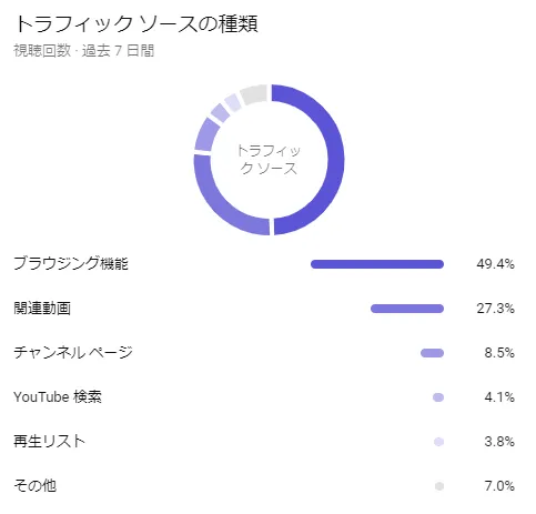 過去28日間における視聴回数におけるトラフィックソースの内訳は上記となります。