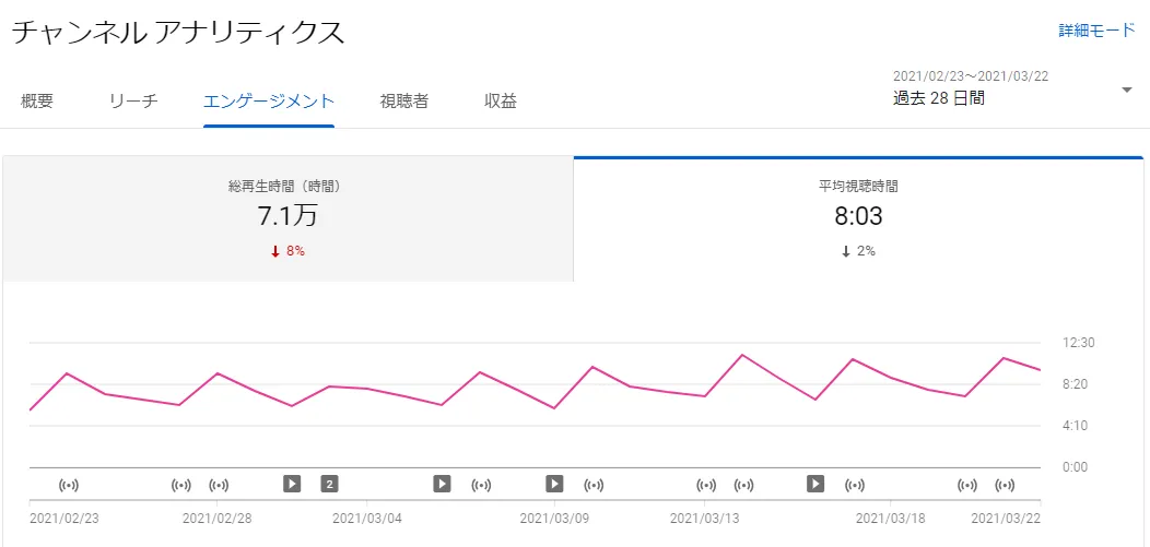 今回のケースでは総再生時間は視聴回数の減少により下落していますが、一方で平均視聴時間は微増しています。
