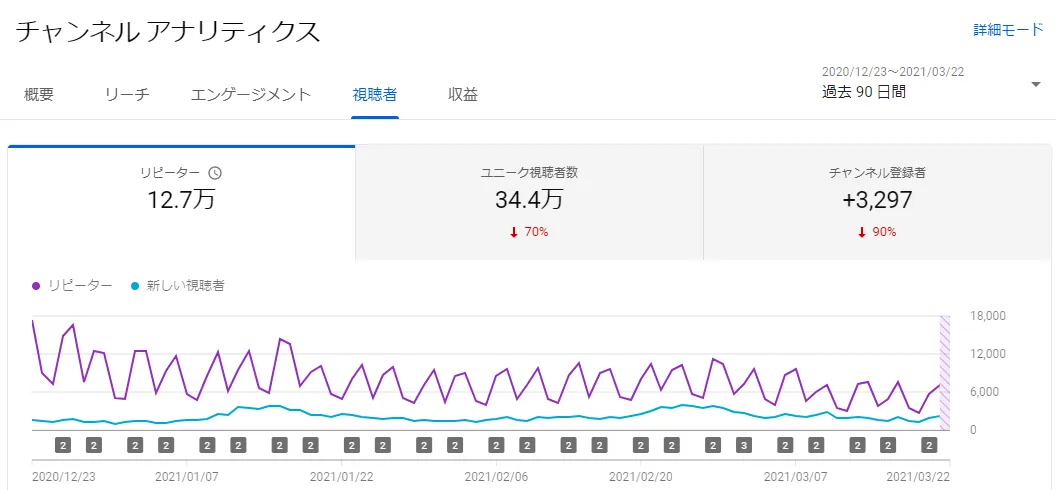 当然ながらチャンネルは更新タイミングで視聴回数が増えるのが通常ですから「どのタイミングでどれくらい更新したっけ?」というところも気になります。