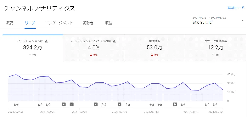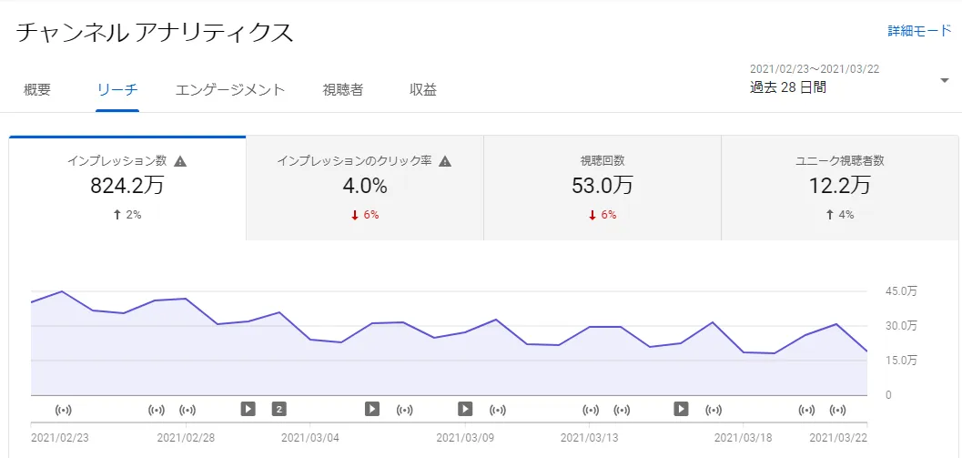 このケースの場合は過去28日間の合算では、インプレッション数(露出数)は若干上がったけれども、クリック率が下がったので、視聴回数は下がったけど、視聴者の「頭数」は逆に増えているということになります。