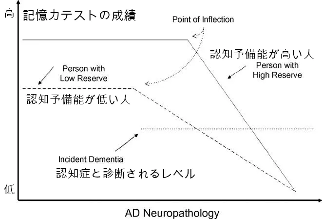 (図はYaakov Stern, Cognitive reserve, Neuropsychologia, Volume 47, Issue 10, 2009, Pages 2015-2028より抜粋して改変)