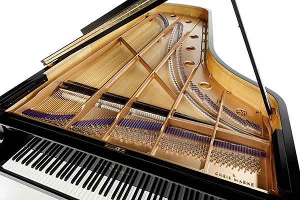 まず、ベースの巻線が銅製でなく、19世紀のピアノのような真鍮製で、良い意味で硬くて振動しにくく、派手さはなく深みのある渋い音が鳴りました。また、交差弦の現代ピアノではベースのハンマーが1センチ弱くらい長いわけですが、平行弦のピアノではハンマーは同じ長さです。たしかに迫力ある低音ではありませんが、チェンバロやフォルテピアノを思わせるようなシンプルですっきりした低音が鳴ります。このようなベースの音が基礎にあるので、高音部も派手でなくてよいという楽器の設計思想を感じました。絶対的なキャパシティは現代ピアノより小さいのですが、そのぶんキャパの中でのグラデーションがあり、表情豊かに聞こえてきました。