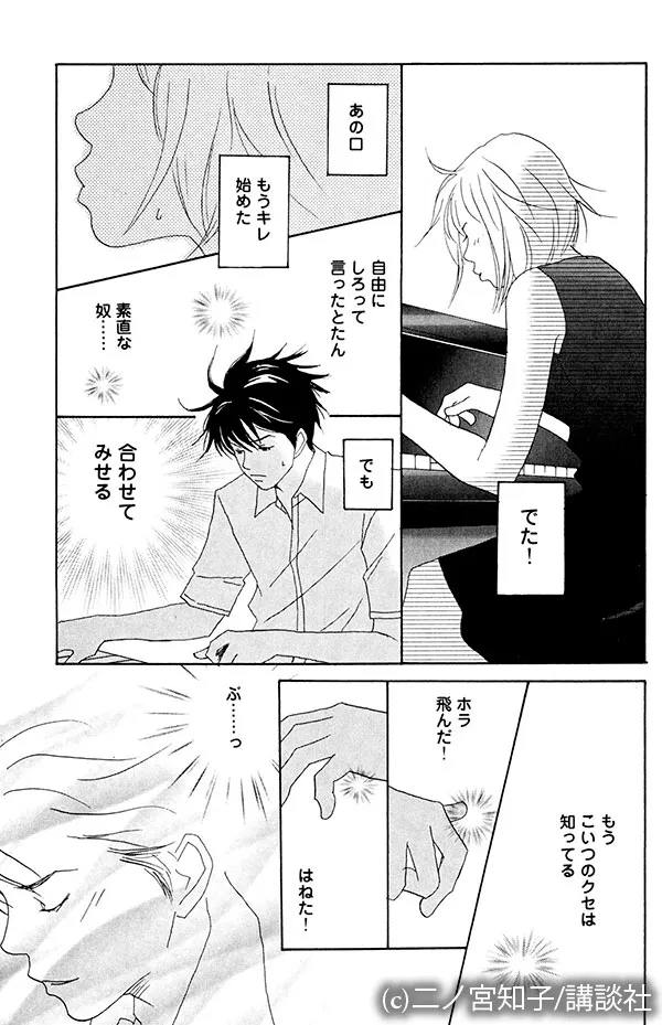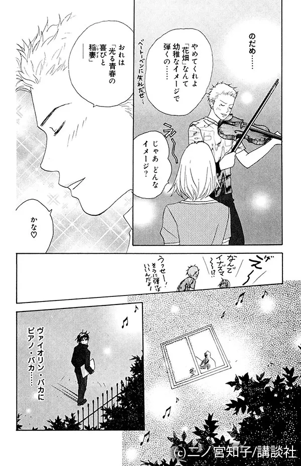 「俺の感性について来い!」というロックなヴァイオリン科学生、峰龍太郎。のだめは試験でのピアノ演奏を頼まれますが、お互いに自由な2人、アンサンブルとは何か、クラシックの曲は自由に弾いてはいけないの!?と壁にぶち当たります。